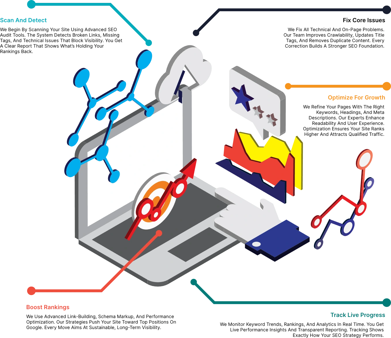 Our team analyzes keywords, fixes technical issues, and builds authority through quality content and backlinks. Each step targets higher visibility and stronger ranking stability.