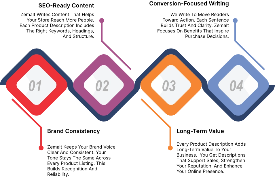 - Real Results: Zemalt creates product descriptions that attract customers and drive sales. Each description highlights value, builds trust, and encourages action. Our writing focuses on clarity, accuracy, and a strong appeal to improve conversions. Every word is written to deliver measurable results.