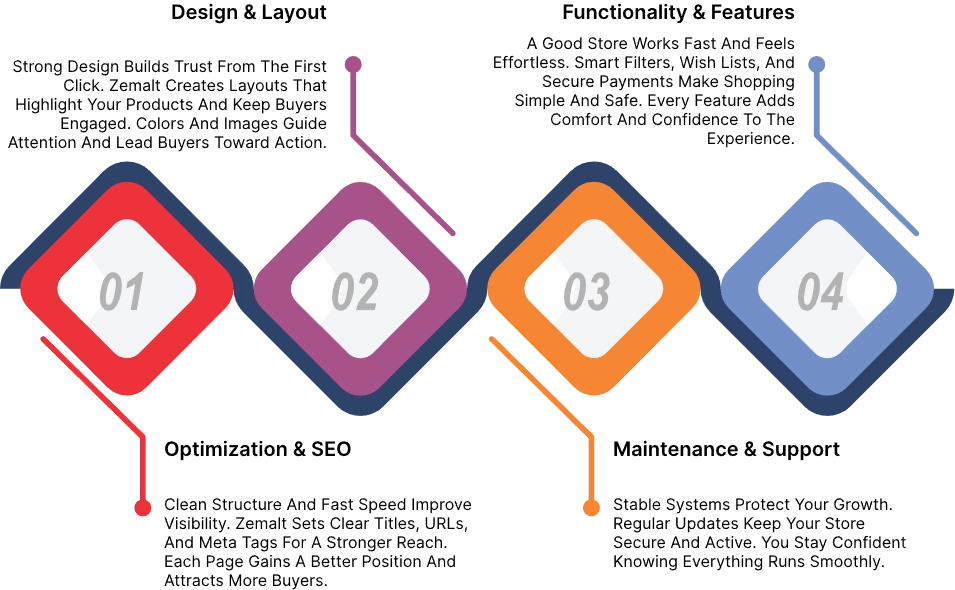 A creative design turns visitors into customers. Zemalt develops layouts that reflect brand identity and attract attention. Colors, fonts, and visuals stay consistent to build trust and appeal. Each page delivers clarity, style, and confidence.A strong website depends on flawless development. Zemalt builds pages, product systems, and secure payment modules with precision. Every feature adds function and stability to the store. The result is a smooth, reliable, and complete setup.