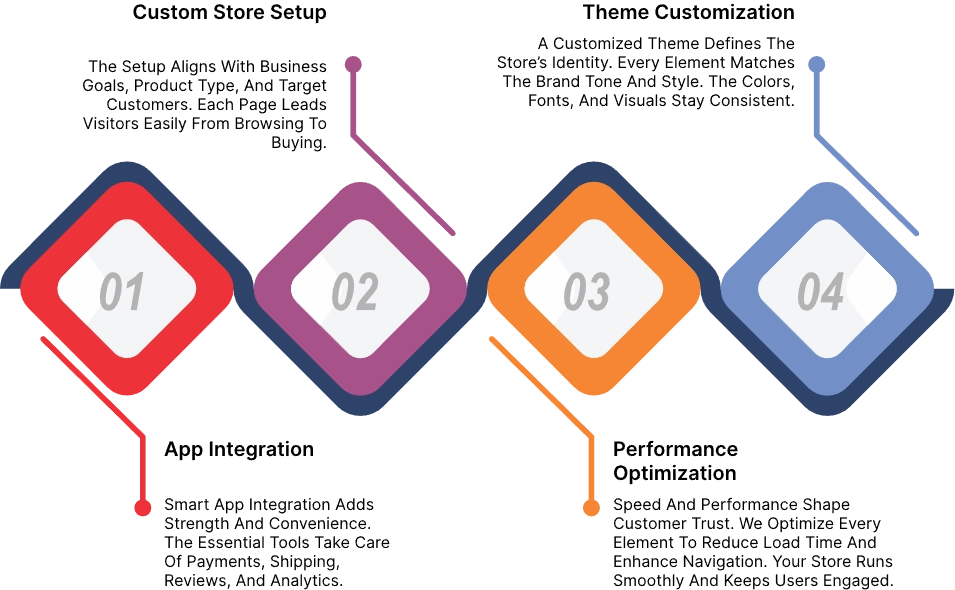 This stage includes Shopify app integration that manages payments, shipping, reviews, and promotions. Each addition adds efficiency and saves time. The setup ensures stability and scalability as sales grow. Secure gateways handle transactions safely. A short and direct checkout reduces cart abandonment.